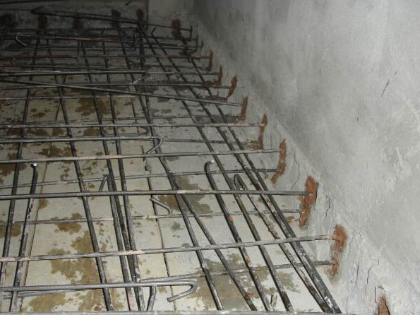 在注膠前梁底模板就已支好,便于植筋后鋼筋定位。植筋前要把鋼筋植入部分用鋼絲刷反復(fù)刷,清除銹污,再用酒精或丙酮清洗。鉆孔內(nèi)注完膠后,把經(jīng)除銹處理過的鋼筋立即放入孔口,然后慢慢單向旋入,不可中途逆向反轉(zhuǎn),直至鋼筋伸入孔底。
